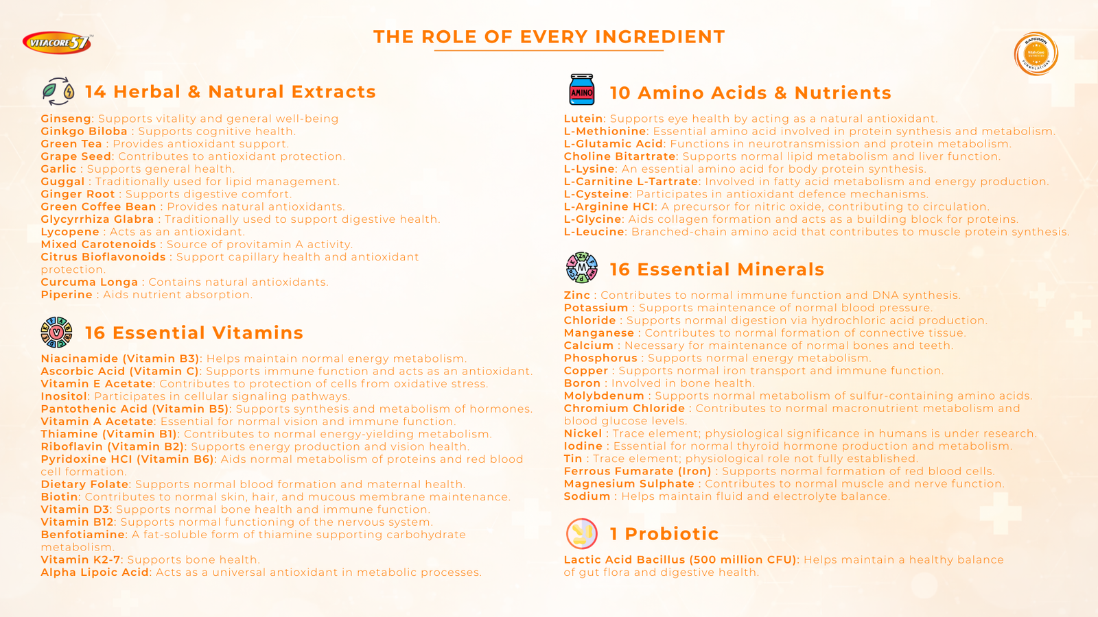 VITACORE 57 ensures a balanced daily nutrition with the powerful blend of 57 vital nutrients that includes vitamins, minerals, amino acids, natural extracts and probiotic.